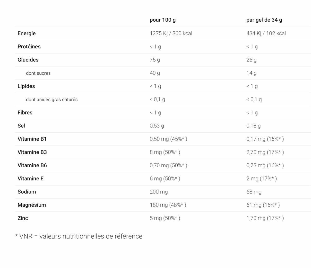 Each dose of gel provides 26g of carbohydrates, equivalent to 100 kcal.